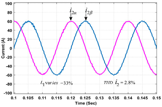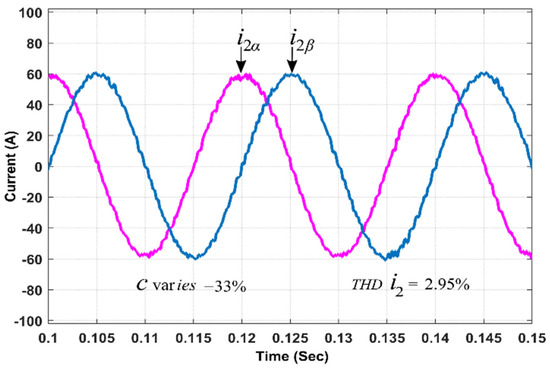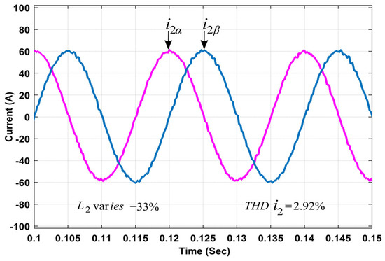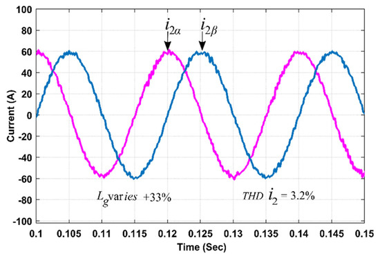 Finally, to analyze the controller performance under the filter parameters variation, the value of the filtering capacitor, VSI side, and grid side inductors varied by −33% from the nominal value, for which the current waveforms in Figure 8, Figure 9 and Figure 10 clearly shows that the grid current maintains high quality and THD value is much lower than the upper bound from the grid operators. In the GC-VSI system to consider the temperature variations, aging effects, and system parametric variation value when multiple inverters are connected in parallel, a 33% variation of is considered. It can be observed in Figure 11 that controller performance is still accurate and satisfies the THD limit for grid connections, even in worse conditions. The dynamic analysis of controller performance shows that it can effectively damp the resonance and maintain the stability, even under extreme operating conditions.