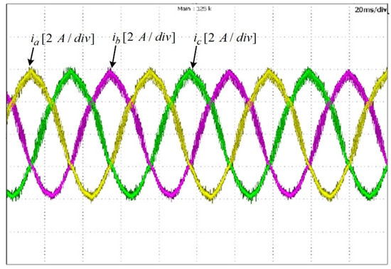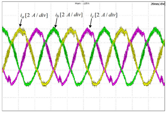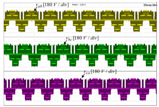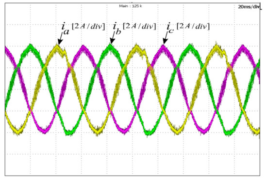 To verify the performance of the proposed control technique, a 1 kW prototype system is fabricated and tested to prove the simulated results. A three-phase VSI is assembled from three CM150DU-24FA Mitsubishi Insulated-gate bipolar transistor (IGBT) modules, and a DSPTMS320F28335 controller is used for control purposes. In addition, LA 55-P current sensors and LV 25-P voltage sensors by LEM are used for current and voltage measurement, respectively. To obtain clean ac output, current space vector modulation is implemented; the inverter output voltages without filtering are shown in Figure 12. The three-phase output current delivered to the grid under nominal conditions is shown in Figure 13. The result for controller performance under filter parametric variation presented in Figure 14 proves the effectiveness of the controller. In Figure 15, to depict the controller performance in the presence of utility grid disturbance, an external inductor is attached, which shows the robustness of the controller.
