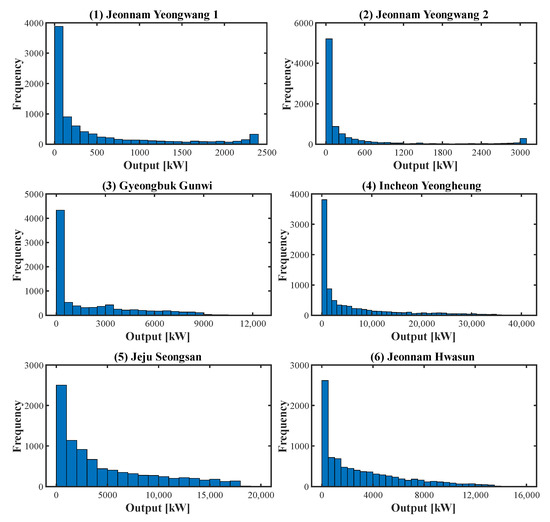 In this paper, data measured from six regions in the Republic of Korea are used and named WPD. The data can be found in the “Public Data Portal” system [31]. The period of all data is one year, the time interval is 1 h, and the unit is kW. If the data are negative, they are corrected to 0. Regions and installed capacity are listed in Table 1, and histograms of WPD for the six regions are shown in Figure 1.
