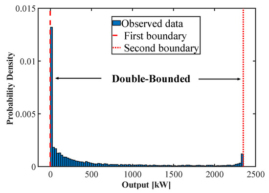 WPD has double-bounded characteristics [29]. A boundary exists both when the output is 0 and the output is at installed capacity (i.e., maximum output). The data range is 0 < x < maximum output, and the total probability within the data range must be 1. Figure 3 shows the double-bounded characteristic of the WPD. The first bound means that the wind power generation cannot be negative, and the second bound means that the wind power generation cannot exceed the installed capacity.