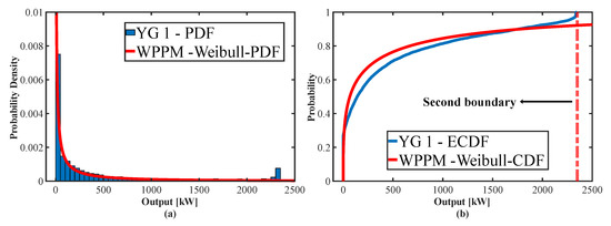 Table 2 lists the parameters of the Weibull distribution estimated in the six regions [32]. A parametric distribution such as the Weibull distribution cannot model the double-bounded characteristic of WPD. Figure 4 shows the PDF and empirical CDF (ECDF) of WPD and WPPM generated from Weibull distribution (WPPM-Weibull) in YG1. Probability must exist only within the double bounds of the WPD. However, in the Weibull distribution, the probability leaks beyond the second boundary, as shown in Figure 4b, so that total probability is less than 1 within the data range.