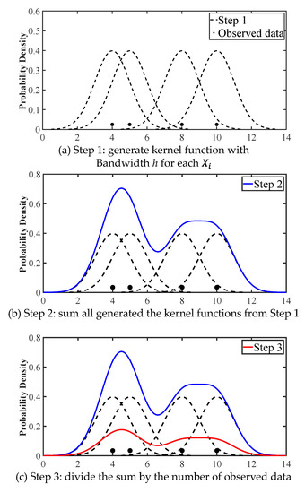 KDE is a non-parametric method that estimates PDF directly from observed data. An estimate of the unknown true density is constructed from the observed data. The procedure by which the observed data is reconstructed through KDE is described in Figure 5. The equation is as follows [33]: