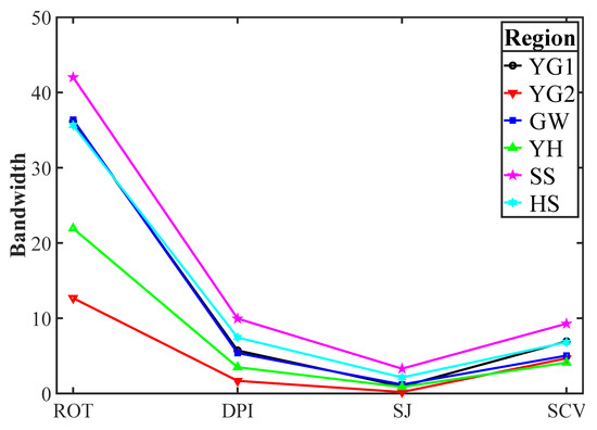 Figure 7 shows the bandwidth values calculated from the normalized WPD of the six regions. Four bandwidth selectors, ROT, DPI, SJ, and SCV, calculate bandwidths within a certain range regardless of the characteristics of various normalized WPDs. Additionally, the normalization factor for WPD and the optimal bandwidth have a linear relationship.
