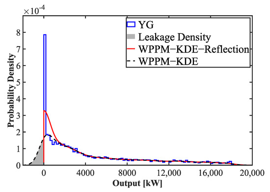 The bandwidth calculated using the bandwidth selector is dependent on the installed capacity, but tied values exist only when the output is 0, regardless of installed capacity. This means that the tied values cause leak density. Unlike the boundary bias that arises from boundaries, this is leakage density caused by too many values connected to a single point. Suga [37] solves this problem with multiple bandwidths. Otherwise, the paper uses the KDE with multi-kernel function to solve this problem. In particular, the Dirac delta function is used as the kernel function to minimize the leakage density in the range with many tied values. The Gaussian function is used in the remaining range. Figure 9 shows WPPM-KDE-Reflection and WPPM-KDE-Reflection using the multi-kernel method (WPPM-PM). The expression of the multi-kernel function method is as follows: