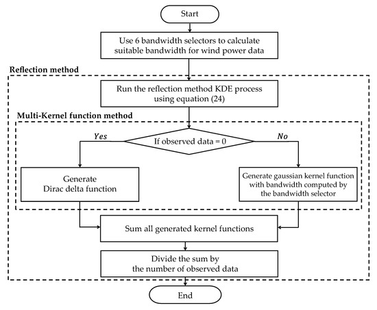 The proposed WPPM (WPPM-PM) is based on the reflection method and multi-kernel function KDE. The WPPM-PM corrects the boundary bias problem with the reflection method. The influence of tied values can be minimized by using the Dirac delta function. A flowchart of the proposed method is shown in Figure 10.