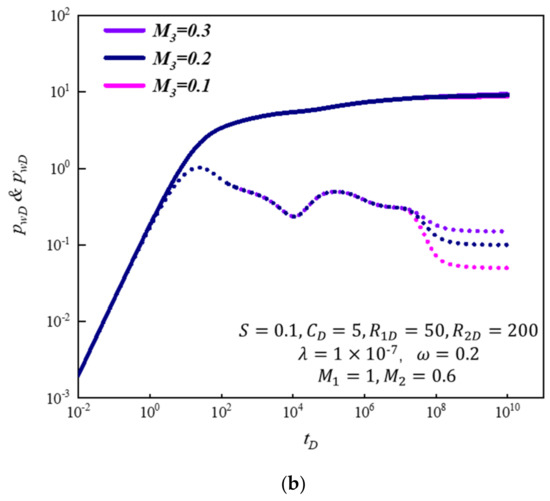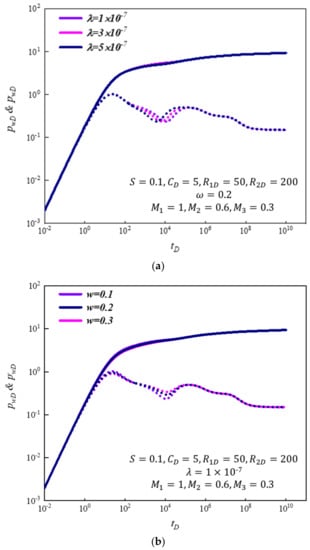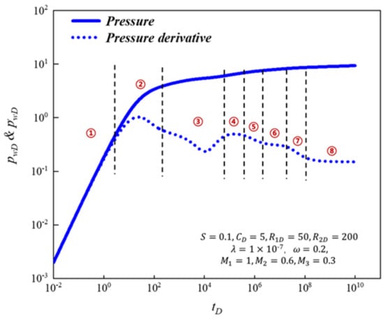 - There were eight flow regimes for the model in the gas condensate reservoir, including the wellbore storage regime, transitional flow regime, interporosity regime, first radial flow regime, second transitional flow regime, second radial flow regime, third transitional flow regime, and third radial flow regime. The area composite radius had little influence on the pressure curve and was mainly on the pressure derivative, which was manifested in the appearance of the transitional flow regime between two adjacent areas. The fluidity ratio was similar to the area composite radius and the main influence was also on the pressure derivative curve, which was manifested in the upscaling or downscaling of the curve.