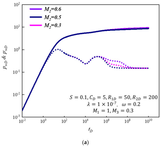 - The wellbore storage coefficient and skin factor mainly influenced the early production performance. The pressure derivative curve was mainly affected by the cross-flow coefficient and storage capacity ratio, which showed the amplitude of the V-shape and the time of its appearance.