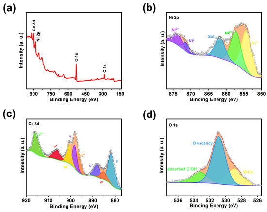 Compositional analyses of the resultant Ni/CeO2 HJ-NSs. (a) XPS surveys, (b–d) high-resolution XPS spectra of (b) Ni 2p, (c) Ce 3d, and (d) O 1s.