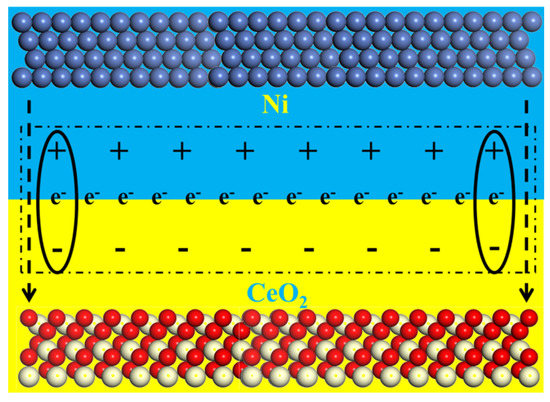 In addition, the reason for the high HER performance of the Ni/CeO2 HJ-NSs catalyst is further analyzed by the schematic diagram in Figure 5. The work function of metallic Ni is lower compared to that of the n-type semiconductor CeO2. Hence, electrons will spontaneously pass through the Mott–Schottky heterojunction interface until equilibrium of the work function is reached [45]. More electrons accumulated at the CeO2 interface will generate a local chemically reducing environment that facilitates the conversion of Ce4+ to Ce3+. More notably, the content of Ce3+ is positively correlated with the amount of oxygen vacancies (as discussed in the above XPS) [46]. High concentrations of oxygen vacancies are even more capable of promoting HER processes [47]. The change in oxygen vacancy concentration due to the strong interaction between Ni and CeO2, which alters the electronic properties of CeO2 as well as enhances the electron enrichment and overall electrical conductivity at the interface, further increases the electron transfer efficiency and improves the catalytic reaction process. Therefore, the high overpotential and large Tafel slope compared to single component metal Ni in alkaline solution accelerates the Volmer step in the HER process by electron coupling with the Ov-rich CeO2, conferring a faster reaction kinetic process. Based on the above discussion of the mechanism, the substantial increase in oxygen vacancy concentration caused by the Mott–Schottky structure supports the excellent alkaline HER performance of Ni/CeO2 HJ-NSs.