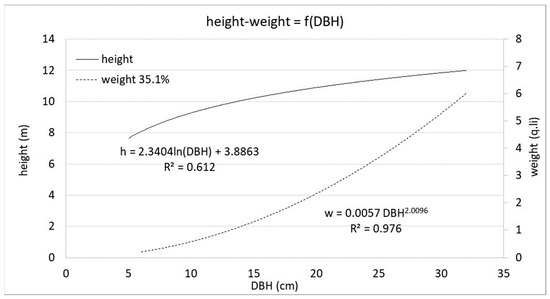 Figure 2 displays the hypsometric curve and the weight curve of the forest stand. The hypsometric curve shows a good correlation between diameter and height with an R2 = 0.612. On the other hand, the tree weight curve illustrates a variation, as a function of DBH, from a minimum of 0.22 to a maximum of 6.72 quintals (fresh basis) with an R2 = 0.976.