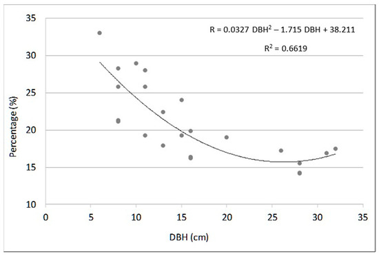 The study of the residual biomass potential revealed that BT accounted for 19.8% of the total biomass harvested. In detail, for the 5–15 cm diameter classes, the average potential recoverable biomass was 24.2% of the full trees; for the classes 15–25 cm, the recovery was equal to 18.3% of the full trees, while for diameters greater than 30 cm, the residues represented 15.7% of the full tree biomass. Figure 3 shows how the recovery percentage of BT varied as a function of the DBH.