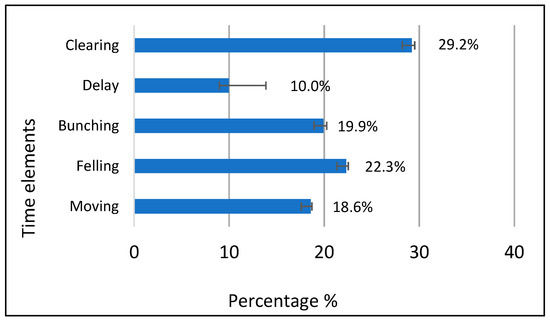 The first machine analyzed was the excavator with a forest shear; this machine exhibited a PMH15 equal to 8.32 t h−1 and a PMH0 equal to 9.25 t h−1. Considering only the principal operations (moving, felling and bunching), the average processing time of a single tree was equal to 0.98 min, corresponding to a PMH15 of 11.7 t h−1 and PMH0 of 13.67 t h−1. The analysis of the entire work cycle of the exavator/shear showed that the clearing phase accounted for 29.2% of the operative time, while downtime was equal to 10.0% (Figure 4).