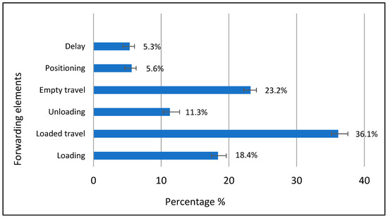 On the other hand, the loading and unloading phases accounted for 18.4% and 11.3%, respectively, while positioning and delays contributed to about 5% of the operative time. The PMH15 of the forwarder resulted in 9.10 t h−1, while the PMH0 resulted in 10.21 t h−1 (Figure 5). The mean speed of the machine during loading and unloading were 2.6 and 3.5 km h−1, respectively.