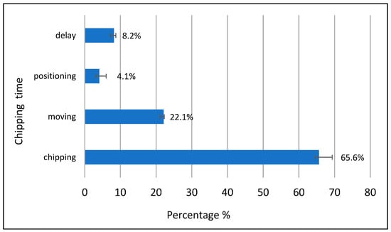 The operating results of the chipper indicated how this process was conditioned by the phases of the chipping and moving of the woody material, which accounted for 65.6 and 22.1%, respectively (Figure 6). Taking into account the load of two trucks, the working-time analysis revealed a PSH15 of 33.9 t h−1 and a PSH0 of 37.37 t h−1 for the chipping operation.