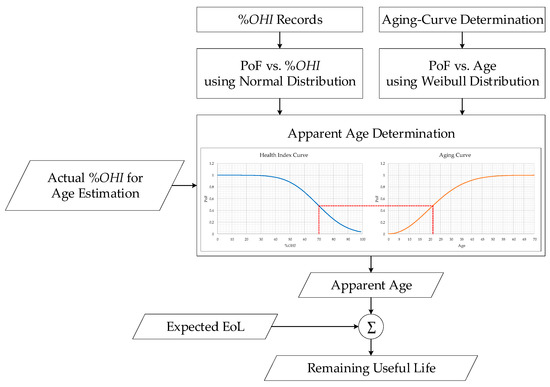 After the annual %OHI records of each retired underground cable system were sufficiently collected, statistical analyses were carried out to determine the correlation between the %OHI records and the aging of the equipment. Normal distribution was applied to determine the relationship between PoF and %OHI—known as the HI curve. Weibull distribution was used to estimate the aging behavior of equipment by determining the relationship between PoF and age—known as the aging curve. The procedure for RUL estimation is set out in Figure 3. Two additional inputs were used in the RUL evaluation process. These were the estimated actual %OHI and the expected EoL of the system.