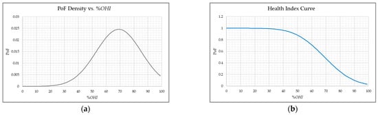 In Figure 3, on the left-hand side, normal distribution is used to estimate the failure probability of sample retired underground cable systems based on a mean and a standard deviation [16,20]. The probability of failure of underground cable systems is a combination of the system failure rate and %OHI, which illustrates the relationship between PoF and %OHI. This illustration was then confirmed by means of regression analysis of historical %OHI records of retired cable systems. With respect to the normal distribution analysis, three functions were used to determine the PoF from the %OHI, as follows: probability density function (PDF) or f(x); cumulative distribution function (CDF) or F(x); and survival function or S(x), as expressed in Equations (6)–(8) [13,18].