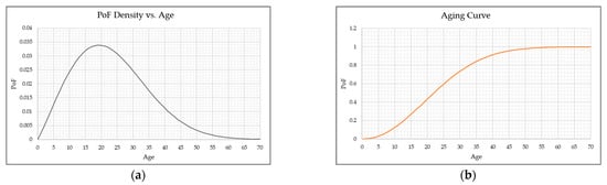 The α and β parameters were used to define the location and slope of the exponential rise of the aging curve. These two parameters were selected to closely reflect the typical aging process of the underground cable systems. The asset groups considered in this study had various EoL values ranging from 20 to 42 years. This finding was mainly a consequence of the typical lifetime of cross-linked polyethylene cables, which is typically 30–40 years, depending upon manufacturer design and international standard recommendations [4,9,30,31]. Using Equation (10), the value of α and β parameters has been estimated as 26.2 and 2.1, respectively, resulting in a shape of aging curve similar to that of the HI curve [16,28]. The failure probability density and aging graphs for the degradation characteristic of the asset’s cable system are shown in Figure 5a and b, respectively.