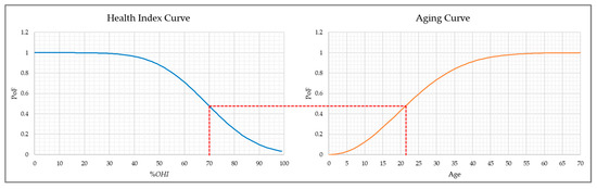 Second, the apparent age of the considered underground cable system was calculated using Equations (11)–(13). Equation (11) is a rewritten form of Equation (6) which was used to determine the PDF according to the %OHI value of each system. Equation (12) is rewritten from Equation (8) and used to calculate the PoF of such a system using a survival or health index curve, such as that shown on the left-hand side of Figure 6. Finally, Equation (13) was used to calculate the apparent age of the system under consideration.