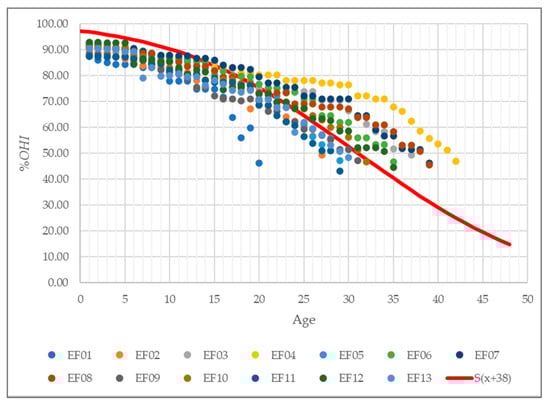 For the purposes of RUL estimation, we obtained the mean, variance, and standard deviation values for the 13 systems to calculate the PDF and S(x) functions, using Equations (6) and (8), resulting in the HI curves shown in Figure 4a and b, respectively. The obtained HI curve was then compared with the aging curve to estimate the apparent age of the underground cable systems, as illustrated in Figure 6. The results of the apparent age and the percentage age difference compared with the actual age are presented in Table 7. The RUL estimation resulted in very high errors at the beginning stage of the asset life (1st–10th years) due to the lack of recorded data for statistical estimation purposes. This means that the RUL evaluation method described here is not suitable for cases of premature failure or for burn-in periods; however, results for later years show that this method is applicable for aged underground cable systems, as per the stated objective of this work. When considering only the period between years 11 and 42, we found an average error of 3.79%, a minimum error of 0.29%, and a maximum error of 11.83%, and these figures are within the range generally considered as acceptable, i.e., that the average error should not exceed 5%.