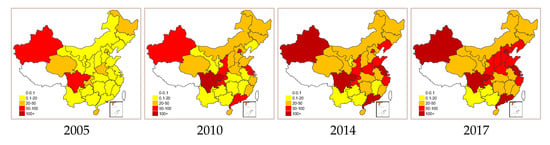 From 2005 to 2017, the consumption of natural gas in China’s provinces increased significantly, and it had obvious characteristics of the spatial dependence on the pipe network, as shown in Figure 1. Before and after several key time nodes, such as 2004 (the West First Line was put into operation), 2010 (the Sichuan-East Gas Transmission Line was put into operation), and 2013–2014 (the West Second Line and the West Third Line were put into operation, and the China–Myanmar Line was officially ventilated), the natural gas consumption in related areas was greatly increased, reflecting that China’s natural gas consumption extends along the pipe network in space, forming a zonal or arc distribution across regions. Specifically, natural gas consumption has generally formed a “W-shaped” distribution in space, with Xinjiang, Heilongjiang-Sichuan and Pearl River Delta as the “peak” and the middle area as the “valley”. This typical “center-periphery” system shows that China’s natural gas consumption has a “concentrated shadow” in space, and the imbalance phenomenon is fully reflected. Locally, China’s natural gas consumption shows a variety of forms, such as “single peak” (Xinjiang), “spindle” (north-south) and “dumbbell” (Beijing-Tianjin-Hebei-Pearl River Delta, Xinjiang-Beijing-Tianjin-Hebei, Xinjiang-Pearl River Delta), which are typical “club” clusters. This implies that natural gas consumption is spatially related, and a consumption cluster is formed in the process of consumption growth.