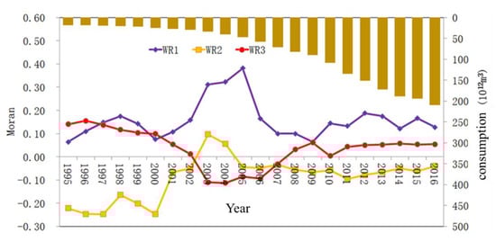 We have constructed the first-order (WR1), second-order (WR2), and third-order (WR3) spatial weight matrixes to observe the spatial correlation of natural gas consumption between neighbors and cross-regions, as shown in Figure 2. First-order denotes the connection of a province and its neighbor. Second-order denotes the connection of a province and its neighbors’ neighbor. Third-order can be explained in the same way. These three Moran’I indexes help us to examine global and local spatial patterns of natural gas consumption [28].
