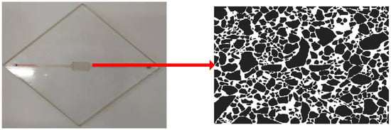 - Microscopic visualization model (shown in Figure 1): the material is glass with hydrophilic characteristics, high temperature and high-pressure resistance, changeable wettability (hydrophilic/oil film plating), strong bonding ability, good transmission imaging effect, etc.; Model size (L × wide × Thickness) is 75 mm × 75 mm × 3 mm, with a minimum diameter of 10 μm. The overall hole throat diameter of the chip is distributed in the range of 10–200 μm. Crude oil viscosity is 12.58 MPa·s and crude oil density is 0.86 g/cm3.