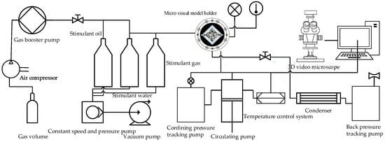 The high temperature and high-pressure microfluidic experimental device is shown in Figure 2. It included a high-pressure injection and production system, high temperature and high-pressure environment loading system, high-precision image recognition, and a data acquisition system. The experimental temperature that the device can reach was 150 °C, and the pressure could reach 70 MPa.