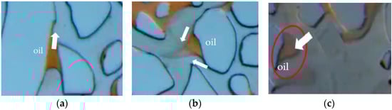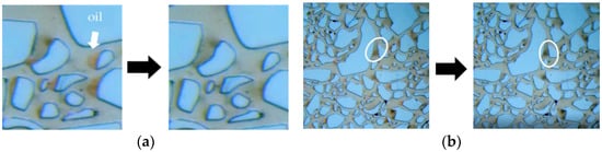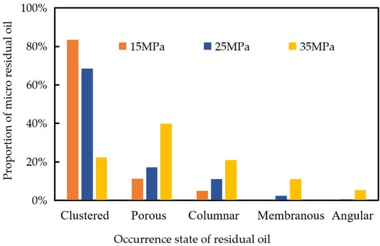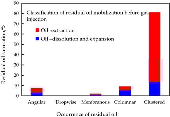 CO2 contacts with the discontinuous residual oil, diffuses and dissolves into the crude oil, which could reduce the viscosity of crude oil and the viscosity between the oil and the rock wall. CO2 extracts light hydrocarbon components in crude oil to reduce oil–gas interfacial tension. In addition, the gas flow experiences shear and driving forces. A large number of discontinuous phase residual oil is displaced by gas, droplet residual oil is carried out by gas extraction wiredrawing, film residual oil is carried out by gas stretching and stripping and column residual oil is carried out by gas extrusion. The displacement effect is good. The remaining oil after huff and puff mainly stays in the reservoir in the forms of film, corner and column. As shown in Figure 12d, when the multiple miscible pressure reaches 35 MPa [26], the occurrence state of the remaining oil will also change. The porous remaining oil is as high as 40%, while the clustered remaining oil is only 20%. The drop-like remaining oil will change into the film-like remaining oil when it touches the matrix surface during the flow process. The corner, drop-like and film-like residual oil will gather into the column-like remaining oil at the small throat, and the film-like, column-like and corner-like discontinuous phase residual oil will increase significantly. CO2 and crude oil dissolve each other, eliminating the interfacial tension, extracting and vaporizing the light hydrocarbon components in the crude oil. This forms a mixed zone of CO2 and light hydrocarbons, which causes heavy component precipitation in the pores. The movement of the mixed zone greatly improves the recovery of crude oil up to 90%.