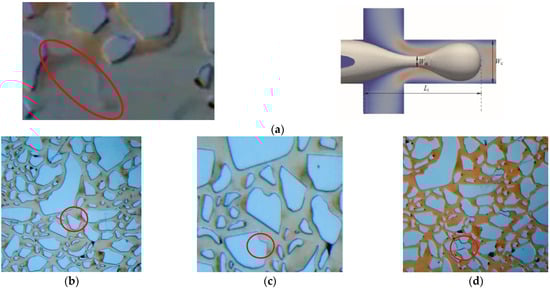 Based on the microscopic visualization experimental research, the four mechanisms of CO2 mobilization were explored. As shown in Figure 6a, the residual oil adhering to one side of the matrix experiences shear force of CO2 flow on both sides, which focuses in one place, and the drop-like residual oil is motivated [21,22]. There is a certain amount of water in the development of shale after fracturing. As shown in Figure 6b at the pores with poor fluidity, funnel-shaped CO2 extracts the light components of crude oil and CO2 flows to carry out crude oil. As shown in Figure 6c, for deep crude oil with large molecular weights, CO2 and crude oil will be mixed by multiple contacts at the void with good fluidity, and a plume-like stepwise mixing state of CO2 crude oil and crude oil will appear. Figure 6d CO2 contacts with the formation fluid and surrounds the crude oil, causing the volume of the crude oil to swell and increasing the formation energy.