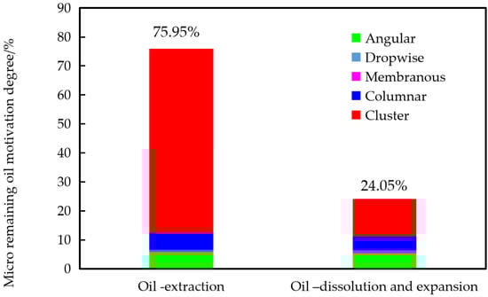 The essence of enhancing the CO2 recovery mechanism is extraction and dissolution expansion, which shows in phenomena such as the miscibility effect, expansion [24], viscosity reduction, improvement of mobility ratio and reduction of interfacial tension. As shown in Figure 7, CO2 gas directly contacts crude oil to extract its light components. CO2 dissolves into the crude oil and the crude oil expands. The micro experiment of gas flooding after hydraulic fracturing is used to quantitatively characterize the action weights of the two mechanisms. The mobilization mechanism of residual oil in different shapes is divided into extraction and dissolution expansion. After processing with the software ImageJ, different mechanisms of micro residual oil were obtained. As shown in Figure 8 and Figure 9, the production of crude oil by CO2 extraction reached 75.95%. The dissolution rate was only 24.05%.