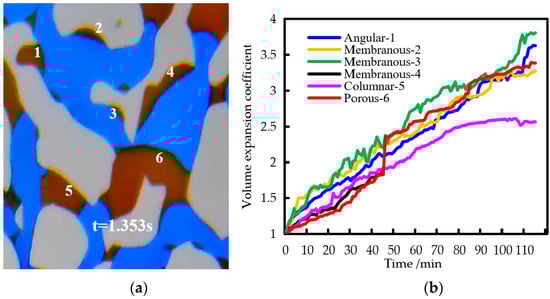 CO2 contacts and dissolves into crude oil, which leads to crude oil swelling. The volume expansion ability of crude oil in different occurrence states is quantitatively characterized, as shown in Equation (1). The expansion areas of corner-1, membrane-2, membrane-3, membrane-4, column-5 and porous-6 at different times were measured, and their volume expansion coefficients were calculated.