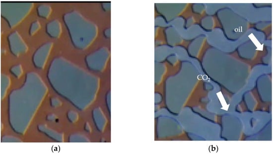In the process of gas injection at the closed outlet end, as the pressure and the injected gas increases, the gas gradually enters the etching area of the pore structure (as shown in Figure 3). With the increase of pressure, more gas enters the crude oil [13]. CO2 can then displace a portion of the crude oil into the macropores and microfractures, which could also cause gas channeling in the macropores.