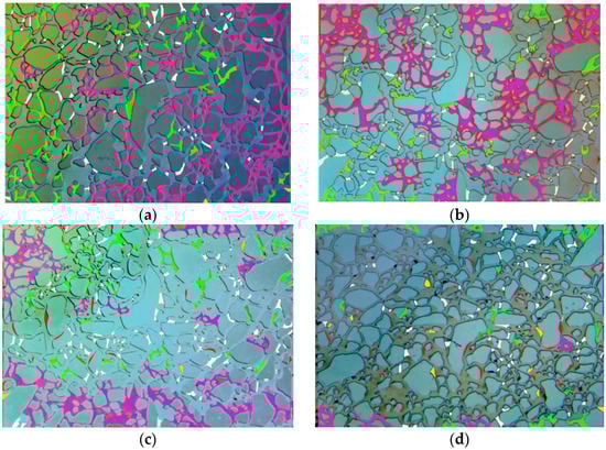 As shown in Figure 11, when the soaking pressure is 10 MPa, the color change of crude oil is not obvious, the volume of CO2 dissolved into the crude oil is small and a large amount of CO2 still exists in the form of gas in the pores. Due to the pressure gap between the inlet and outlet, CO2 migrates in the pores, and CO2 migrates between the pores and throats in a “compression–release” cycle, squeezing the crude oil and diffusing around. In the cross-distribution area of multiple throats, the converged CO2 will plunge along one of the throats with less resistance, resulting in a decrease in the pressure at the converging point. After the pressure is reduced, the CO2 at the convergence point does not have enough pressure to force CO2 into other throats, so insufficient pressure will reduce the swept area of CO2. The process of gas flooding is a step-by-step displacement process. Under the condition of sufficient soaking pressure, gas will enter the next pore step-by-step, which improves the recovery of crude oil. As shown in Figure 12a, the cluster-like residual oil accounts for more than 80% of total residual oil under 10 MPa. During the production stage, non-wetting phase displaces the wetting phase. There is a large interfacial tension between gas and liquid, and there is a large number of Haines jump phenomena occurring [25]. Gas fingers in and out, forming a gas channel. The sweep coefficient is small. After the experiment, the residual oil mostly exists in a sheet shape.