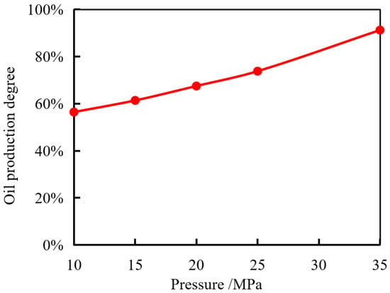 As shown in Figure 14, it is found that the increase in the soaking pressure leads to the gradual increase of the crude oil recovery. Under the miscible pressure, the soaking pressure is 15 MPa, which only increases the crude oil recovery by 4.94% compared with 10 MPa. When the soaking pressure increases by 10 MPa, the crude oil recovery increases by 12.41%. When the gas injection pressure is higher than the miscible pressure, the recovery of crude oil at 35 MPa is significantly increased by 23.74% compared with 25 MPa, and the recovery of crude oil is as high as 91.22%.
