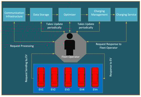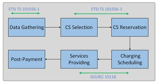The system cycle of on-the-move EV charging management is illustrated in Figure 4 [,,].