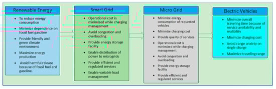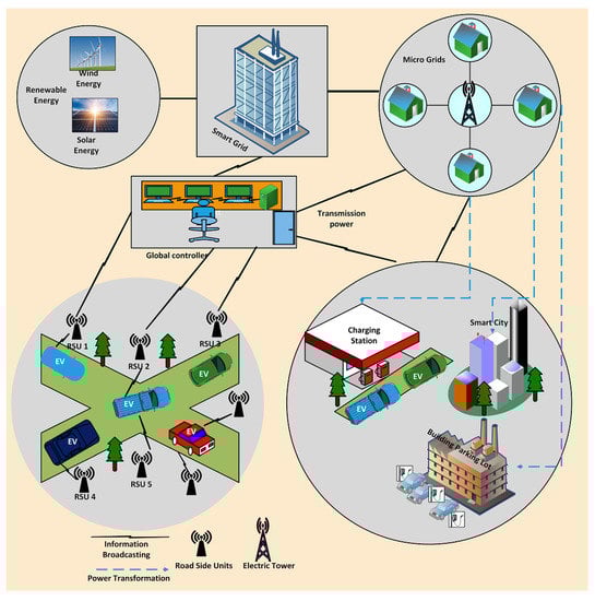 Transportation resources play an essential role in managing environmental pollution. The air pollution caused by CO2 emission in internal combustion engine vehicles (ICEV) has been drastically increased. Keeping in view the catastrophic effects of climate change, the development of an environmentally friendly transportation system has become a goal of researchers and the automobile industry. Therefore, the idea of developing and commercializing electric vehicles (EV) has gained the interest of the people. Due to these reasons, the majority are switching from ICEV to EV to reduce CO2 and particulate emissions which are driving the EV transportation industry [,]. According to the recent studies from the Centre for “Solar Energy and Hydrogen Research”, the demand for EV accounted for a global market is more than 740,000 EV in early 2015. In the coming 50 years, the number of EVs is expected to increase to 2.5 billion [,,]. The fast-increasing ratio of EVs invites both challenges and opportunities [,]. On one hand, the high load because of the integration of EV into the smart grid raises concern about the possible impact to the voltage stability, operation cost and frequency excursion at the transmission and generation side. On other hand, EVs will be used as a new energy storage system that can serve many purposes. Sufficient energy storage in batteries of EVs suggested static versus mobility charging infrastructure and the most extensive application with microgrids is bidirectional charging and discharging [,]. However, in bidirectional charging during off-peak hours, EVs can charge the battery and store the electricity from the microgrids. Where in peak hours, EV can transfer the stored energy back to microgrids to complete the demand of the other EVs user [,,].