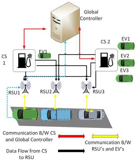 Centralize vs. Distributed Charging: In centralized charging management, EV is charged with the help of a third party global controller (GC), wherein distributed charging each EV individually selects a CS with the help of local information, On board Unit (OBU) and installed map []. Further details are provided in Section 3.