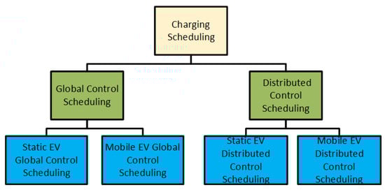 Online and Offline Charging Scheduling of EV: Online charging scheduling refers to the real-time scheduling of EV. In the element of online charging, scheduling includes event-driven, system time, causal information, random data, knowledge of future data and objectives. Where in offline charging scheduling is the day ahead management of EV charging requests [,].