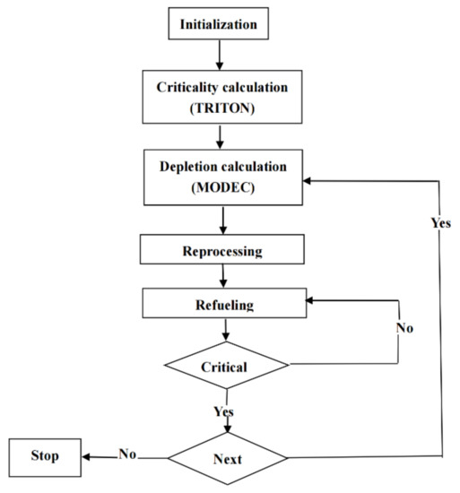 Unlike the traditional reactors, the continuous on-line refueling and removal of FPs in MSR make the depletion calculation more difficult. To simulate the depletion of MSR with continuous online refueling and reprocessing, an in-house program called TMCBurnup was developed in our previous work [32]. It couples the cross-section processing and multigroup neutron transport calculation module (TRITON) and a novel depletion code MOlten salt reactor specific DEpletion Code (MODEC) [33,34]. The flowchart of TMCBurnup is shown in Figure 3. First, the parameters of core and blanket are initialized by the user. Then, the neutron transportation and depletion calculations are performed by the TRITON module and MODEC, respectively. Next, fissile nuclides and 232Th need to be refueled into the core, the total mass and the ratio of fueled 232Th and fissile nuclides are determined by ensuring the total heavy metal inventory is constant and keeping the reactor critical. The calculation is performed iteratively until the pre-set burn up period is reached.