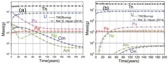 3.2. Evolution of Heavy Nuclides Inventories and Mass Flow