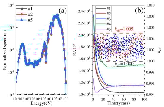 Normalized spectrum (a) and evolution of EALF and keff (b).