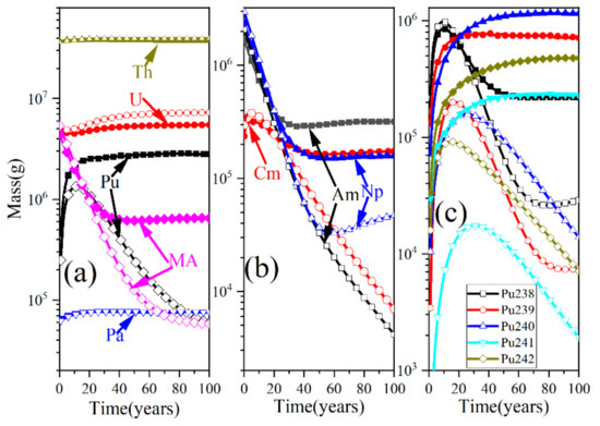 The evolution of primary heavy nuclides under different scenarios was investigated, and the calculation results are shown in Figure 6a–c. For a clear comparison, only the evolutions of heavy nuclides in the core for scenario 1 and scenario 2 are shown, the masses of the main heavy nuclides at the initial stage and in EQL are listed in Table 4. It can be found that, for scenario 1, the mass of MA decreases monotonically due to the fission and capture reactions. The mass of Pu increases rapidly at the beginning to reach its maximum value at 12 years due to the competition between the generation from MA and the fission reaction of Pu itself, and then declines due to their fission consumption. Furthermore, the mass of 238Pu is the largest of the Pu isotopes, which can be 992 kg at 10 years. The evolution tendency of Pa is almost the same as that of Th, the mass of them increases gradually until EQL is reached, but the amount of 233Pa is much smaller than Th since it is the direct neutron capture production of the 232Th. Different from the evolution of other nuclides, the mass of U declines during the first 10 years due to the fission depletions and then increases to the EQL due to the delayed reactivity of Pu and the capture reaction of 232Th.