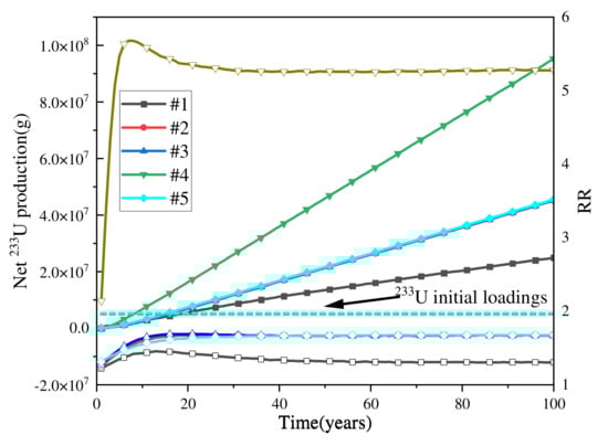 Evolution of net production of 233U (solid dot lines) and RR (empty dot lines).