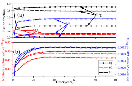 In order to research the evolution law of RR, the fission fraction of each fission nuclide and the (n, γ) reaction rate of 232Th and 233Pa is shown in Figure 8. It can be noticed that the (n, γ) reaction rate of 233Pa is much lower than 232Th, and in the initial stage, the increasing (n, γ) reaction rate of 232Th caused by the softening of neutron spectrum leads to the increase in the corresponding RR under different scenarios. In scenario 1, with the deepening of burnup, the fission fraction of MA decreases, and the fission fraction of 233U increases, which results in a gradual decline of RR. However, in scenario 2 (scenario 3, scenario 5), due to the delayed reactive release of accumulated Pu, the fission fraction related to 233U decreases, so the corresponding RR gradually increases to EQL. As for scenario 4, due to the continuous online feeding of TRU and the extraction of 233U from the core, the fission fraction of 233U decreases, resulting in a rapid increase in RR in the first 10 years. Then, the fission fraction of 233U increases with burn-up, and the corresponding RR gradually decreases to EQL. The continuous extraction of 233U from the reactor core has an obvious effect on the RR. In the whole 100-year operation, the RR of scenario 4 reaches 5.7 at its highest, and in the EQL, the corresponding RR is approximately 5.25, which is much higher than in other scenarios.