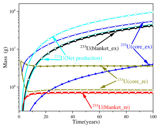 Furthermore, the plot in Figure 9 shows the separate contributions to the 233U production for scenario 3 and scenario 4. It can be seen that the net production of 233U mainly comes from the blanket for scenario 3, while the 233U produced from the core and the blanket is comparable in scenario 4. In scenario 3 and scenario 4, the production of 233U from the blanket is almost the same, while much more 233U is produced from the core in scenario 4, resulting in a significantly larger net 233U production. As seen from Table 3, it can be found that in scenario 4, the 233U produced from the core up to 54,659 kg during the whole operation is approximately 50,000 kg more than scenario 3, and its corresponding feeding amount of TRU is also almost 50,000 kg more than that of scenario 3, which leads to a significant increase in the 233U net production. However, the online reprocessing technology is not yet mature. It is undoubtedly more difficult to continuously extract 233U from the core online.