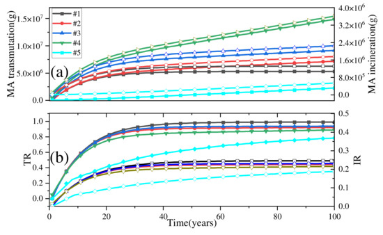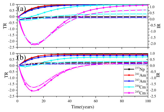 Evolution of MA transmutation (solid dot lines), incineration (empty dot lines) (a), TR (solid dot lines), and IR (empty dot lines) (b).