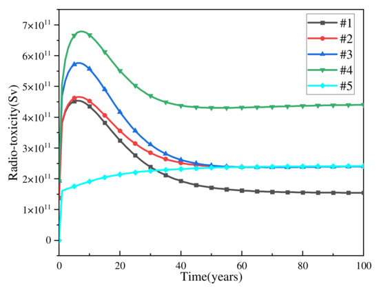 The evolution of radiotoxicity for the five scenarios above is shown in Figure 12. It can be noticed that due to the continuous online feeding of TRU and extraction of 233U, the content of Pu and MA in the core of scenario 4 is the highest, and the radiotoxicity is the lowest in scenario 1 due to the lowest Pu and MA content. In addition, scenario 2, scenario 3, and scenario 5 are almost the same in terms of radiotoxicity because of the same feeding and nuclide extraction method during the whole operation. The high radiotoxicity of scenario 4 during operation will present a greater challenge for immature online reprocessing and spent fuel disposal.