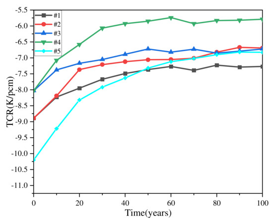 where K and T refer to the keff and the temperature, respectively. The evolution of TCR for 5 scenarios is shown in Figure 13. It can be noticed that due to the large fuel salt expansion feedback coefficient of the MCFR, the TCR is negative enough for all scenarios. Furthermore, the constant value of the TCR for scenario 5 is the largest at BOL since no MA is loaded in the core at the beginning. Due to the same online reprocessing and extraction methods, the TCR is nearly the same for scenario 2, scenario 3, and scenario 5 in EQL, while the TCR for scenario 1 is the largest due to the lowest MA and Pu contents and the highest 232Th content in EQL.