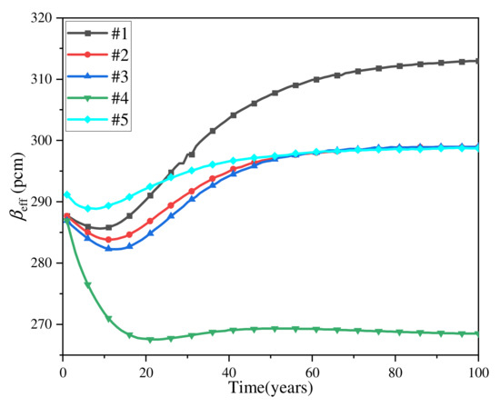 The βs of different scenarios with different depletion times are shown in Table 5. Since the evolution of βeff is almost the same for scenario 2, scenario 3, and scenario 5, thus, only three different scenarios are shown in. For scenario 4, due to the continuous online feeding of TRU and extraction of 233U, 239Pu rapidly becomes the major fission nuclide instead of 233U (see Figure 8a); however, since the βI of 239Pu is smaller than that of 233U, the βs decreases rapidly during the first 20 years, and almost tends to be stable during the remaining 80 years. As for scenario 1, the effect resulting from the MA transmutation (especially 237Np) leads to a decrease in the total βeff. Then, with the incineration of MA, the content of 233U gradually increases, and the positive effect of increasing 233U content on βeff is greater than the negative effect caused by MA transmutation. In addition, the accumulated 235U during the operation also improves the total βeff due to its large value of βI. Thus, the total βeff increases gradually over the last 90 years. The evolution of the total βeff for scenario 5 is almost the same as that of scenario 1, but the final βeff of scenario 5 is 14 pcm smaller than scenario 1 due to its higher MA and 239Pu content in the EQL.