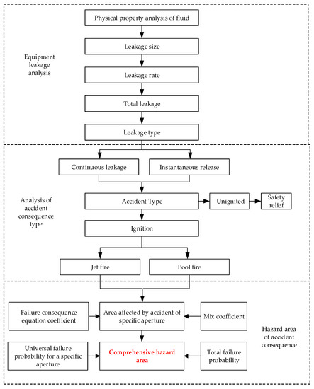 The calculation method of accident impact scope is divided into three parts, namely, the analysis of equipment leakage, the analysis of accident consequence type and the calculation of comprehensive hazard area. In the equipment leakage analysis, it is necessary to calculate the physical properties of stored fluid, leakage size, leakage rate, total leakage amount and leakage type in turn. The accident consequence type analysis needs to analyze the continuous leakage and instantaneous release, respectively, and then calculate the probability of ignition and non-ignition, the probability of jet fire, pool fire and safe release under different conditions. To calculate the hazard area of accident consequence, firstly, we need to calculate the accident-affected area of specific leakage aperture according to the mixing coefficient and equation coefficient, then multiply it by the general failure probability of specific leakage aperture and divide it by the total failure probability of the equipment to finally obtain the comprehensive hazard area of the equipment. The detailed calculation process is shown in Figure 1.